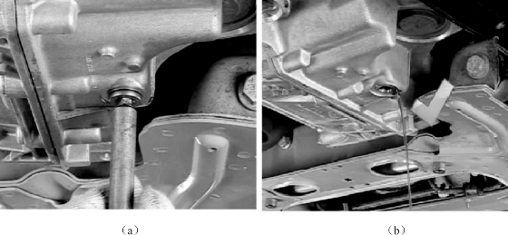 (6)保持发动机怠速运转,举升车辆,拆下防护底板,卸下液面螺钉,有少量油流出,然后逐滴往下滴,如图3-100所示,最后拧上液面螺钉。