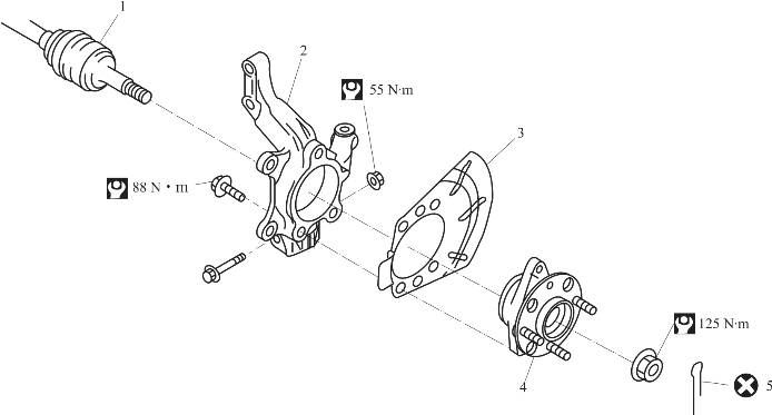 1—驱动轴;2—转向节;3—挡板;4—轮毂和轴承总成;5—开口销