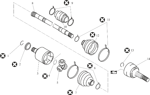 1—环形卡箍;2—防尘罩;3—壳体;4—卡环;5—十字轴组件;6—防尘罩卡箍(变速驱动桥侧);7—防尘罩(变速驱动桥侧);8—驱动轴;9—缓冲器卡箍;10—动态缓冲器;11—防尘罩卡箍(车轮侧);12—防尘罩(车轮侧);13—环形卡箍;14—万向节分总成