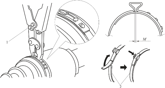 (23)使用防尘罩卡箍卷曲工具,将新的防尘罩卡箍固定在防尘罩的大小端,如图4-17所示,固定防尘罩卡箍使尺寸M为1.0~4.0mm。