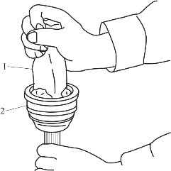 (15)擦拭干净万向节分总成上的润滑脂后,如图4-13所示,在万向节分总成花键孔中涂抹规定的润滑脂,直到新润滑脂开始从球槽和花键孔中流出,然后用抹布擦去流出的润滑脂。