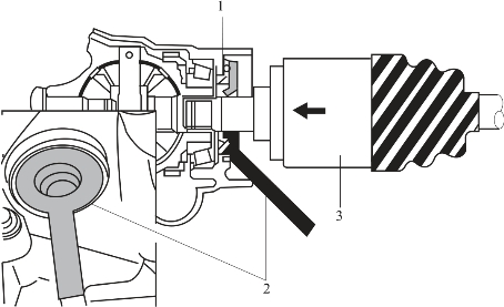 如图4-10所示,确认环形卡箍已固定到边缘上,从驱动桥总成侧撬出驱动轴。拆卸驱动轴时,应注意放置驱动轴万向节的角度不应过大,不得过大拉伸滑动节。
