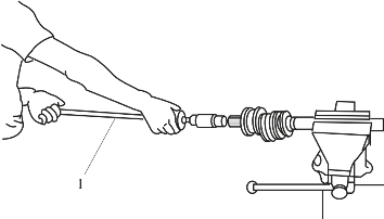 (11)如图4-9所示,将驱动轴拔具拧入万向节分总成螺孔30mm或更长。用一只手撑住驱动轴,用滑动锤从轴中分离万向节分总成。操作时将滑动锤对准驱动轴,稳固地均匀拉出;如果无法拉出万向节分总成,可先从车上拆下驱动轴后再尝试。