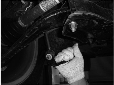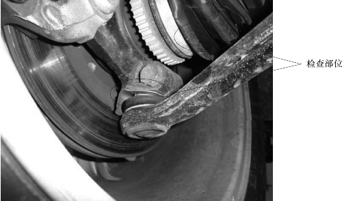 (3)转动检查左、右传动轴,用手摇晃检查左、右转向球头,横向稳定杆连接杆球头,如图4-43所示。