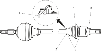 (1)如图4-57所示,在表面c处贴上一片胶带,用以保护差速器出口处的油封表面;从车轮末端拆下防护罩,对于没有定位槽的传动轴,标出防护罩的位置。