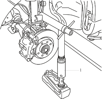 (6)如图4-46所示,使用弹簧压紧器,将固定夹置于减震器柱上,将工具底座平放在地面上,使工具与减震器的纵向中心线和垂直中心线对准,将转节夹锁定在弹簧压紧器底座上,设置弹簧压紧器的高度调节销,拧紧调节螺母压缩悬架弹簧,把转向节从悬架部件上卸下。拆装减震器时,不对转向节夹钳施加压力。