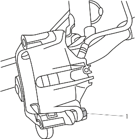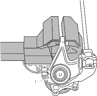 ②如图4-65所示,转动制动钳,拆去前制动衬块,目视检查活塞周围的密封件、防尘帽、护套的状况和安装位置及前制动盘的磨损状况,确保前制动钳销滑动正常。若不正常,应更换任何有故障的零部件。