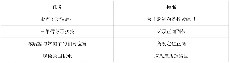 ①将球节固定螺栓安装到位,用一个新螺母拧紧到(40±4)N·m。②转向节夹轴的紧固件,拧紧扭矩为(55±5)N·m。