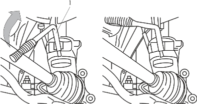 ③如图4-66所示,将硬管上的制动软管拆开并恢复卡箍,将制动管口堵住,拆下制动软管。