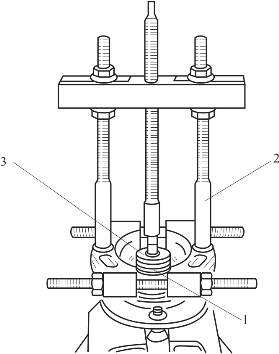 1—前轮毂轴承内圈;2—轴承拔取器;3—止推轴颈