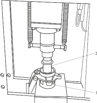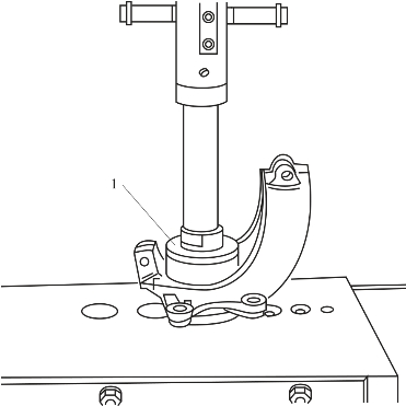(6)如图4-75所示,将内座圈放置到位,轴承提取器限位板放在压力平台上,前轮毂支架放在轴承提取器限位板上,再将螺母放入与前轮毂轴承圈接触,使用压力机压出前轮毂轴承。