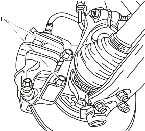 ④如图4-67所示,拆下制动钳支架螺栓,制动钳/支承总成用一根铁丝将其挂起。