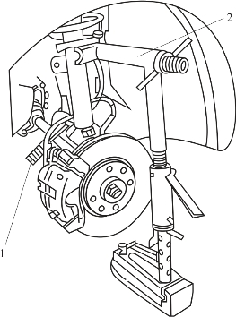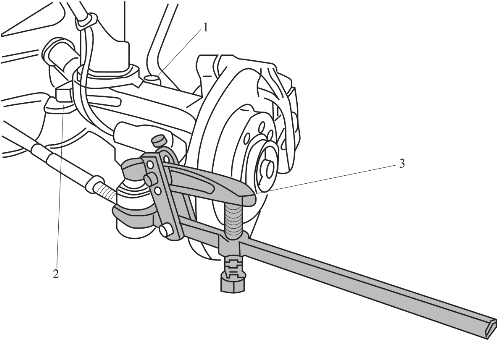 1—卡板螺栓;2—前转向节上的夹钳螺栓;3—球节拔取器