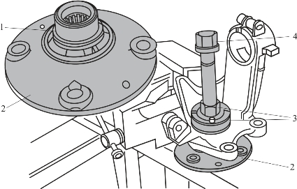 1—前轮毂轴承内圈;2—前轮毂;3—拔取器;4—螺栓