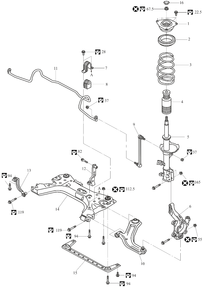 前悬架总成元件组成及螺栓紧固扭矩要求如图5-12所示,扭矩单位为N·m。