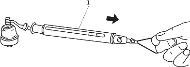 (5)松开转向外套筒的固定螺母,如图5-13所示,使用球节拆卸器从转向节上拆卸转向外套筒,以免损坏球节防尘罩。临时拧紧螺母,防止损坏螺纹及球节拆卸器突然脱落。