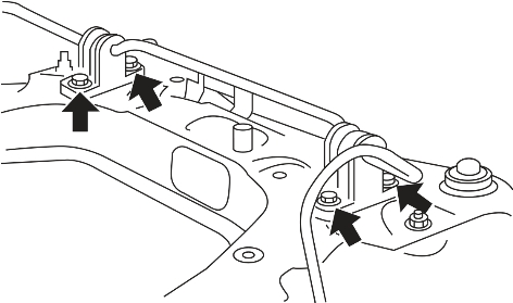 ②松开右上连杆固定螺栓、左上连杆固定螺栓(前悬架梁侧)、前悬架梁固定螺栓(左/右)。应降低前悬架梁以便拆卸横拉杆固定螺栓。