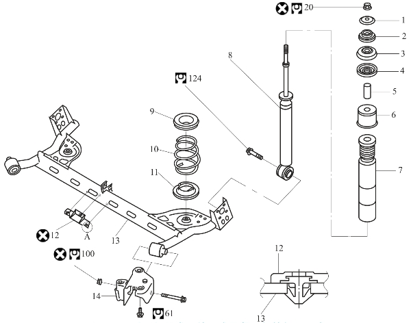 1—垫圈(上);2—衬套(上);3—衬套(下);4—垫圈(下);5—隔管;6—弹跳缓冲器盖;7—弹跳缓冲器;8—减震器;9—后弹簧橡胶座(上);10—螺旋弹簧;11—后弹簧橡胶座(下);12—制动管保护装置;13—后悬架臂;14—后悬架臂支架