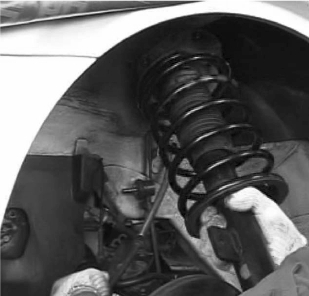 ①拆卸减震器总成紧固螺栓,托住减震器,如图5-59所示。