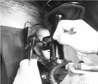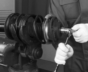 ③用专用工具拧下减震器头部螺母,如图5-64所示,依次取下头部各机件。