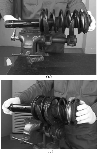 (a)将减震器总成安装到夹具上;(b)压缩螺旋弹簧
