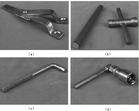 (a)轮毂固定工具ZX 6310-T;(b)传动轴螺母拆卸工具;(c)转向节口分离杠ZX 9501-T.L;(d)专用套筒