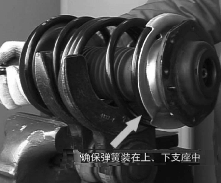 ②减震器总成组装后,确保弹簧与上下支座位置正确,如图5-68所示。