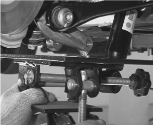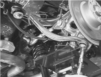 ①在后转向节下放置部件举升器,抬升部件举升器,如图5-87所示。