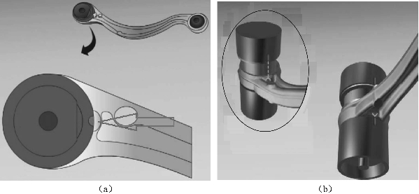 (a)对正挠性支撑与纵臂的标记;(b)对正支撑套筒与纵臂之间的标记
