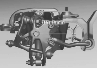 ②拧紧纵臂紧固螺母前,使用部件举升器、车身高度尺,保证后轮中心线与后桥总成安装面距离为111±1mm,如图5-99所示。