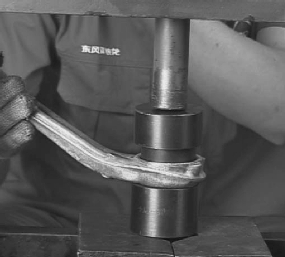 (5)在压力机上拆卸纵臂车身侧挠性支撑,安置好挠性支撑拆装工具,缓慢压出挠性支撑,如图5-94所示,取下专用工具,取出挠性支撑。