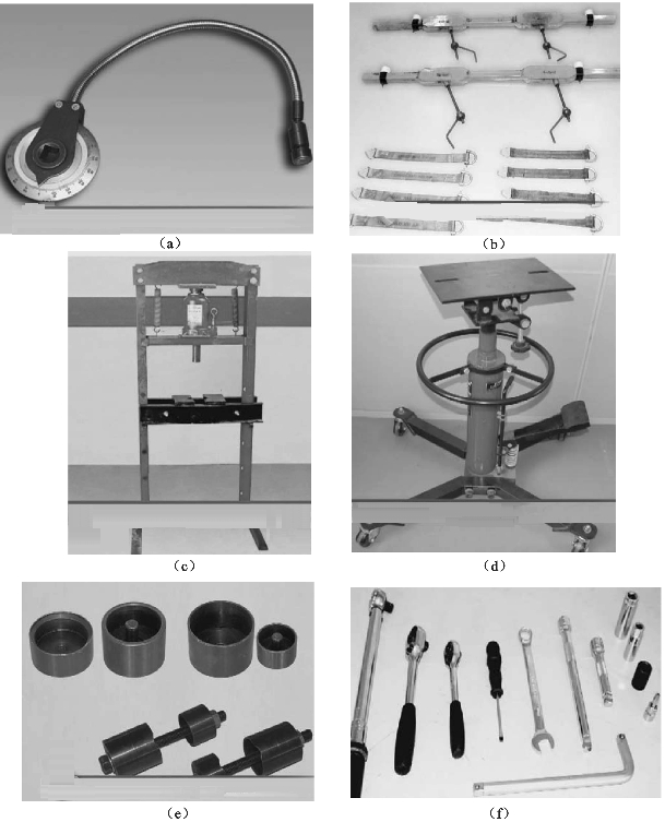 (a)角度拧紧工具;(b)悬架压缩器套件;(c)压力机;(d)部件举升器;(e)后悬架纵臂挠性支撑拆装工具;(f)通用工具