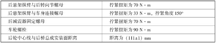 (5)在四柱举升机上将后悬架设置到参考高度后,方可按规定扭矩拧紧后悬架纵臂固定螺母、后减震器固定螺母。