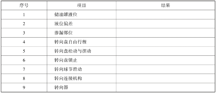 一辆东风雪铁龙新爱丽舍轿车行驶40 000km,前来4S店进行维护,在维护过程中检查出转向盘自由行程过大、动力转向油偏少等问题,因此,应按有关工艺技术标准对汽车转向系统进行维护操作。