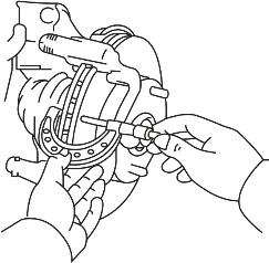 检查制动卡钳中是否有液体渗漏。如果制动液溅出或者黏在油漆上,立即用水漂洗。否则,将损坏油漆表面。在一个配备制动盘内有制动鼓型的驻车制动系统的汽车上,拆卸后盘式制动卡钳和后制动盘以便检查驻车制动器。