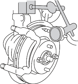 使用一个百分表测量制动盘跳动。使用轮毂螺母临时固定制动盘。测量制动盘跳动以前,检查前轮毂轴承的游隙是否在规定的范围以内。