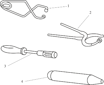 1—轮缸夹钳;2—前制动蹄拆装钳;3—制动蹄保持罩拆装扳手;4——锁止螺母
