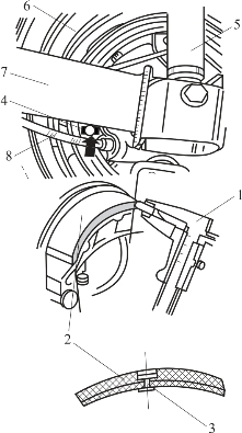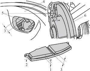 1—制动衬片摩擦片厚度;2—制动衬片摩擦片磨损极限厚度;3—制动衬片的总厚度;4—轮辐;5—外制动衬片;6—制动盘