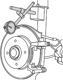 制动盘过度的轴向跳动会使制动踏板抖动或使制动蹄片磨损不均匀。图7-23所示为制动盘轴向跳动检查。
