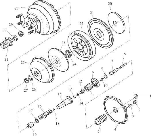 1—前壳体密封圈;2—真空单向阀;3—垫圈;4—前壳体;5—回位弹簧;6—主缸推杆;7—反作用杆;8—反作用盘;9—反作用体座圈;10—反作用活塞;11—反作用体;12—阀门弹簧;13—固定卡环;14—反作用缓冲垫;15—控制阀柱塞;16—控制阀推杆;17—保持圈;18—О形圈;19—毛毡过滤环;20—第二托板;21—第二膜片;22—隔板;23—第一托板;24,29—衬套;25—第一膜片;26—膜片保持圈;27,30—消音器;28—后壳体;31—防尘套