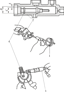 1—内径表;2—制动主缸泵体;3—千分尺;4—主缸活塞;A—泵体与活塞的间隙;B—泵体内孔的直径;C—活塞的外径