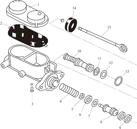 1—储油罐盖;2—膜片;3—活塞定位螺钉;4—弹簧;5—皮碗护圈;6—前皮碗;7—皮碗保护垫圈;8—前活塞;9—后皮碗;10—后活塞;11—推杆座;12—垫圈;13—锁圈;14—防尘套;15—推杆