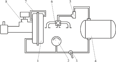 1—真空加力气室;2—真空表;3—开关阀;4—真空储气筒;5—单向阀;6—发动机进气歧管;7—通气管;8—辅助缸