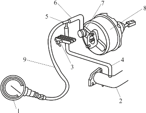 1—真空表;2—进气歧管;3—卡紧装置;4,6,9—软管;5—三通接头;7—单向阀;8—真空助力器