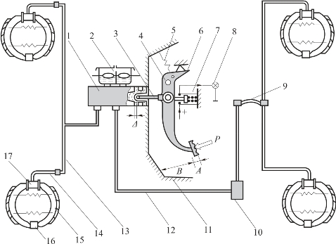 1—制动主缸;2—储油罐;3—推杆;4—支承销;5—复位弹簧;6—制动踏板;7—制动灯开关;8—指示灯;9—软管;10—比例阀;11—地板;12—后桥油管;13—前桥油管;14—软管;15—制动蹄;16—支撑座;17—制动轮缸;Δ—自由间隙;A—自由行程;B—有效行程