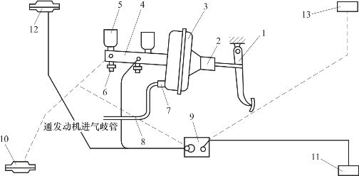 1—制动踏板机构;2—控制阀;3—真空伺服气室;4—制动主缸;5—储油罐;6—制动信号灯液压开关;7—真空单向阀;8—真空供能管路;9—感载比例阀;10—左前轮制动器轮缸;11—左后轮制动器轮缸;12—右前轮制动器轮缸;13—右后轮制动器轮缸