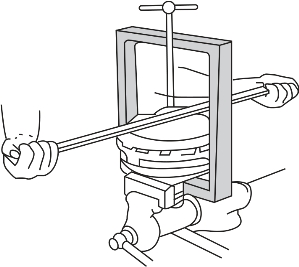 ③将伺服气室后壳体朝下放在夹具中,转动手柄拧紧螺杆压住伺服气室壳体,如图7-37所示。不要压得过紧,以便伺服气室前壳体能够转动。用一个杠杆套在前壳体的主缸固定螺栓上,沿逆时针方向转动前壳体,使前后壳体分开。