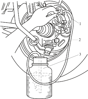 (4)另一人将放气螺塞拧松一下,此时,制动液连同空气一起从软管喷入瓶中,然后,尽快将放气螺塞拧紧。