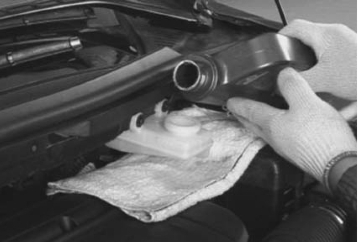 最大限度地排空制动液储液罐,拆卸制动液液位传感器。取出制动液储液罐,方向朝上。
