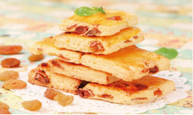 低筋面粉195克,葡萄干60克,玉米淀粉15克,蛋黄90克,奶粉12克,黄油80克